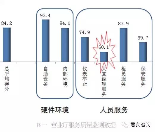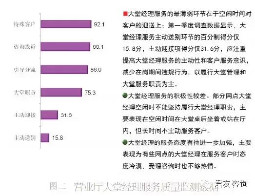 如图一和图二所示是某银行某省会城市分行2011年第一季度营业厅服务监测平均数据,从图一中可以看出,大堂经理服务是营业厅服务中的短板;大堂经理服务的监测数据如图二。