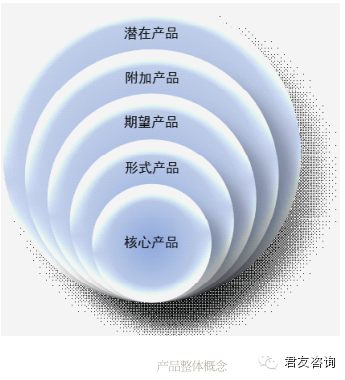 客户花费金钱、时间、体力和精力获得某项产品或服务的目的是什么,他们想得到的利益或利益组合是什么呢?为了回答这个问题,市场营销理论中提出了整体产品概念。这个概念认为,展现在客户面前的产品(或服务)可以分为核心产品、形式产品、期望产品、附加产品和潜在产品五个层面(见图)。