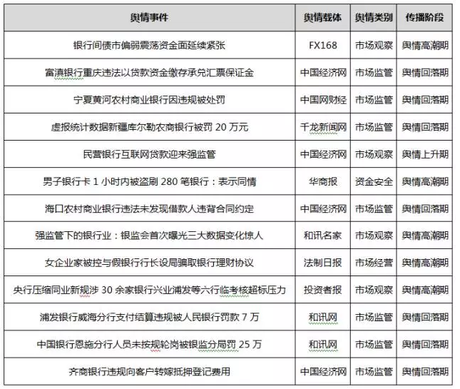 一、本期中国银行业重点网络舆情一览表